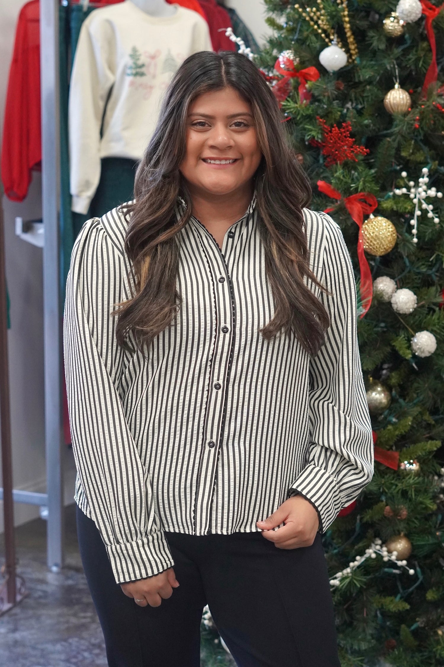 The Stella Striped Scallop Trim Button Up is a classy, statement piece every girl needs! For the holidays, style with statement jewelry and a heel for a look to impress!